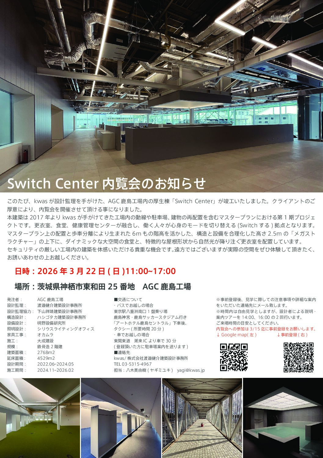 この度kwas が設計監理を手がけた、AGC 鹿島工場内の厚生棟「Switch Center」が竣工いたしました。
